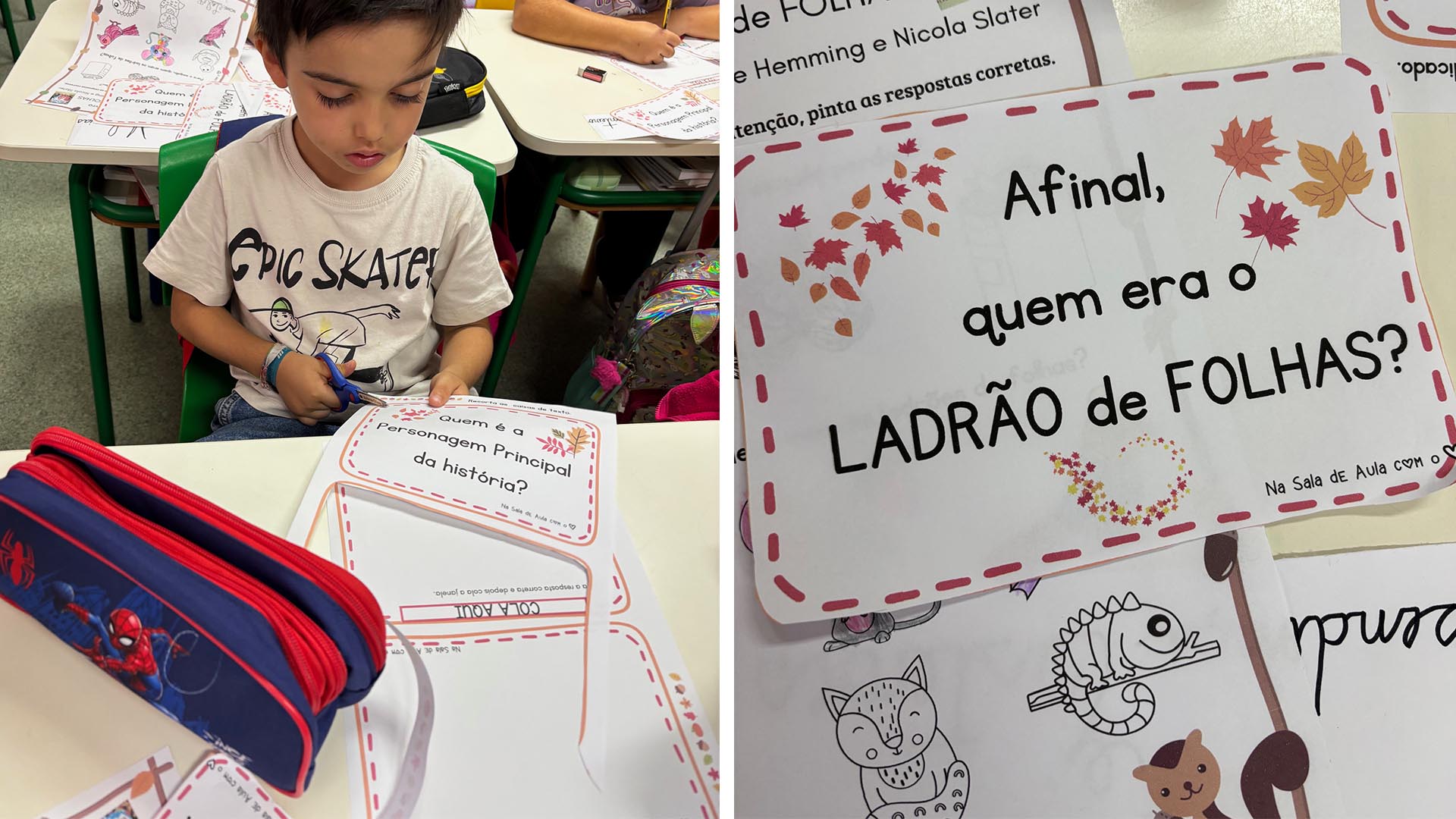 Tudo começou com a leitura da história “O Ladrão de Folhas”, que conta as aventuras de um esquilo surpreendido pelo vento do outono, ao ver as folhas da sua árvore desaparecerem uma a uma. Entre descobertas e desconfianças sobre quem poderia ser o “ladrão”, os alunos acompanharam, com atenção e entusiasmo, esta divertida narrativa.