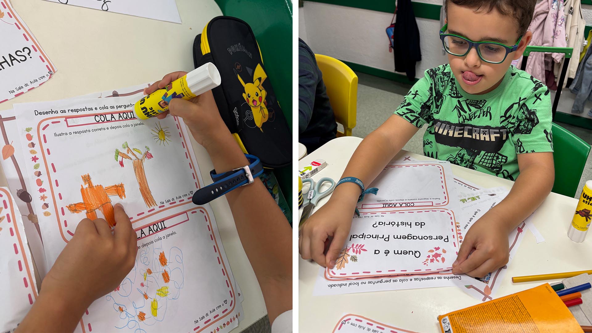Depois da leitura, foi a vez de pôr mãos à obra! Inspirados pela história, os alunos realizaram um trabalho de expressão plástica, recorrendo a desenhos e colagens para recriar as cores e a magia do outono. A atividade permitiu ainda treinar a motricidade fina, já que os mais pequenos praticaram o recorte com tesoura, sempre com muita dedicação e criatividade.