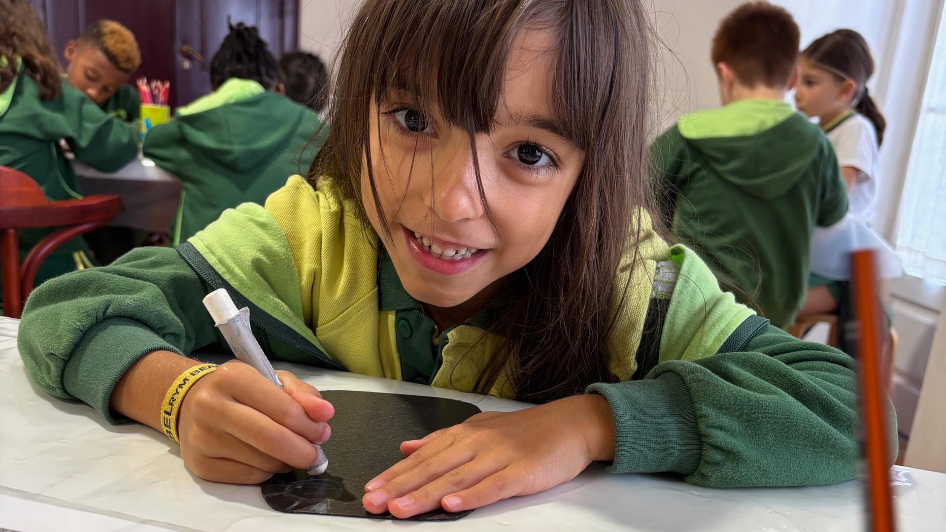 Depois, participaram numa atividade prática muito divertida: pintaram uma “placa preta”, recriando as que eram utilizadas pelos povos pré-históricos. A experiência permitiu-lhes explorar a sua criatividade e sentir-se verdadeiros artistas da antiguidade.