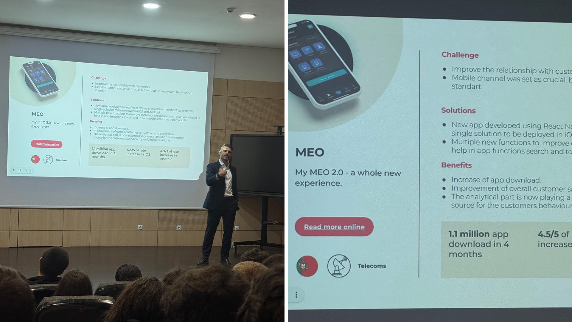 Durante a sessão falou-se de áreas como inteligência artificial, cibersegurança, desenvolvimento de software e transformação digital, e foram partilharam exemplos reais de projetos e desafios tecnológicos enfrentados no mundo corporativo.
