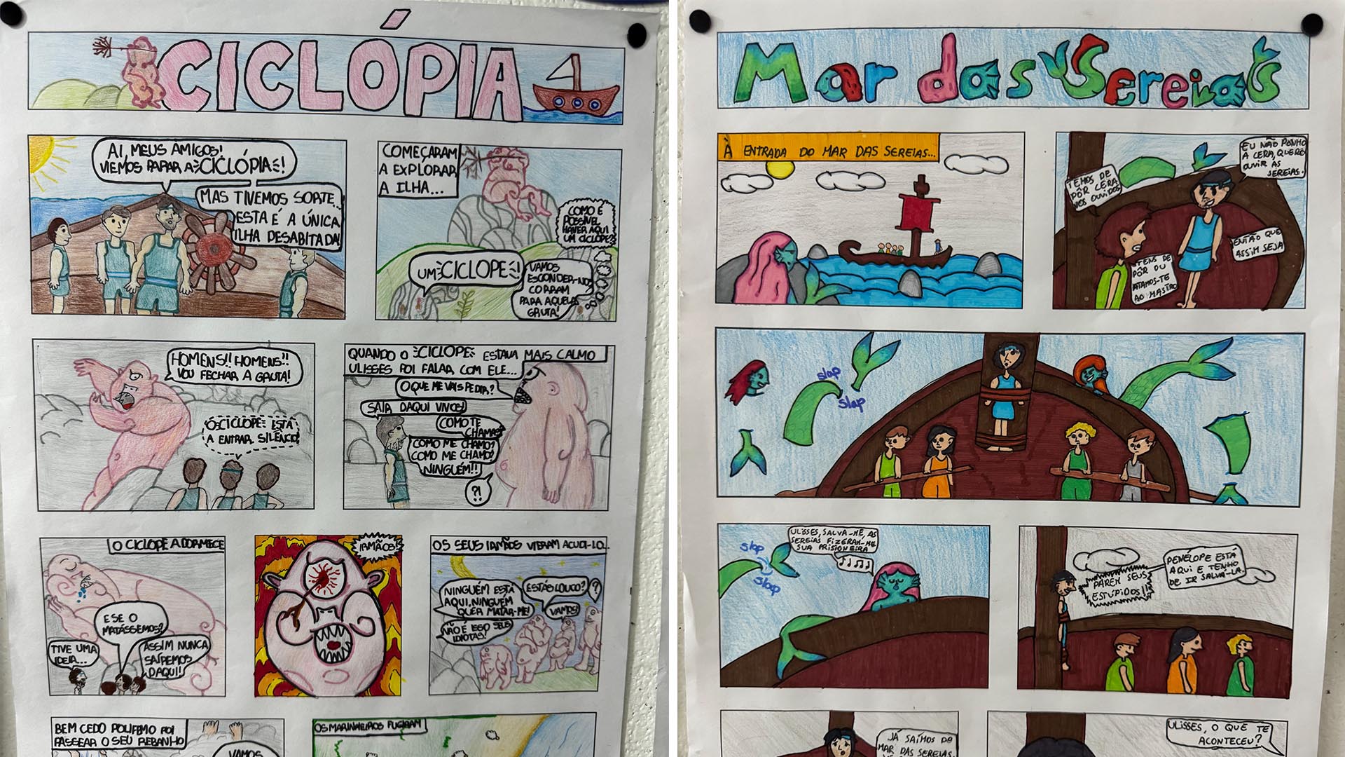 Para criar as suas ilustrações, os alunos escolheram vários episódios marcantes da história, como, por exemplo: “Troia”, “Ciclópia”, “Ilha de Circe”, “Ilha dos Infernos”, “Eólia”, “O mar das sereias” e o “Regresso a Ítaca”.