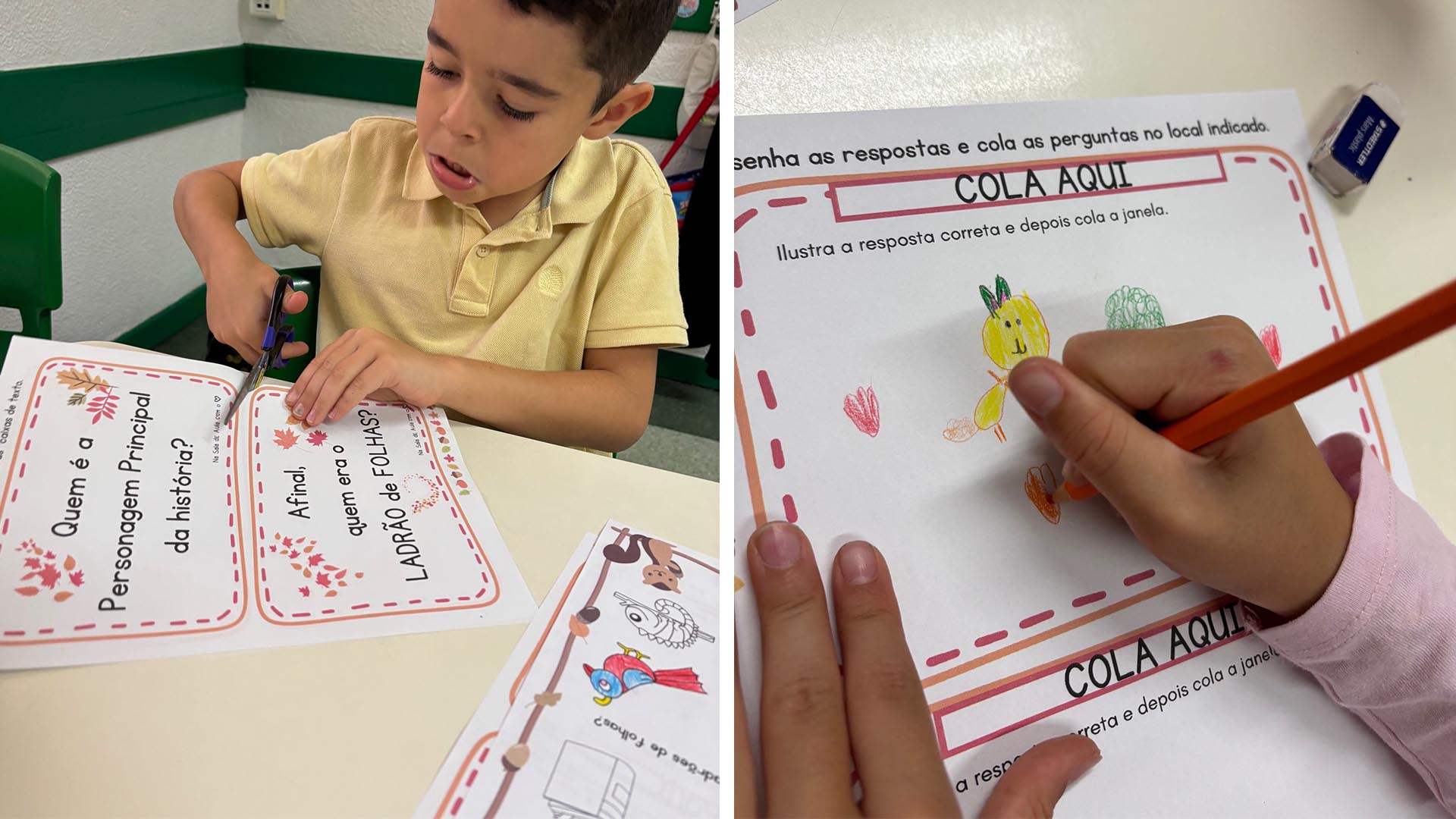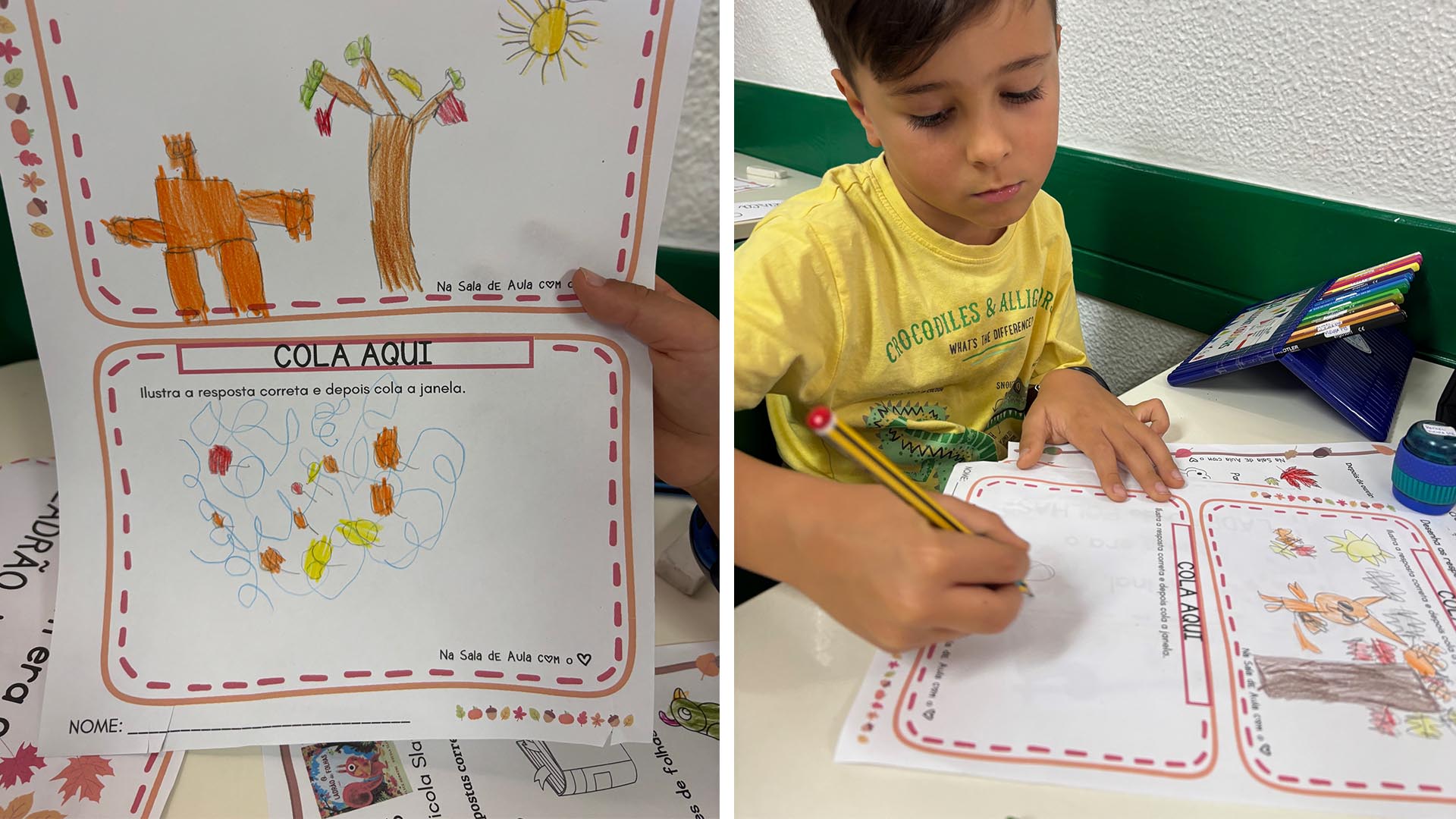 Depois da leitura, foi a vez de pôr mãos à obra! Inspirados pela história, os alunos realizaram um trabalho de expressão plástica, recorrendo a desenhos e colagens para recriar as cores e a magia do outono. A atividade permitiu ainda treinar a motricidade fina, já que os mais pequenos praticaram o recorte com tesoura, sempre com muita dedicação e criatividade.
