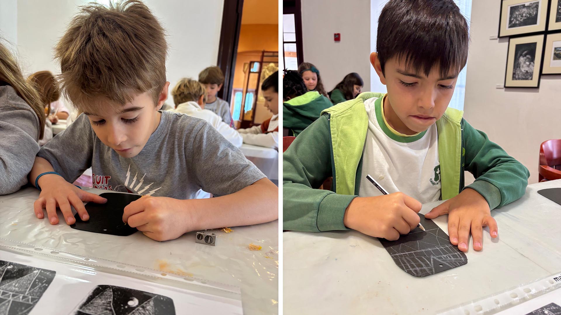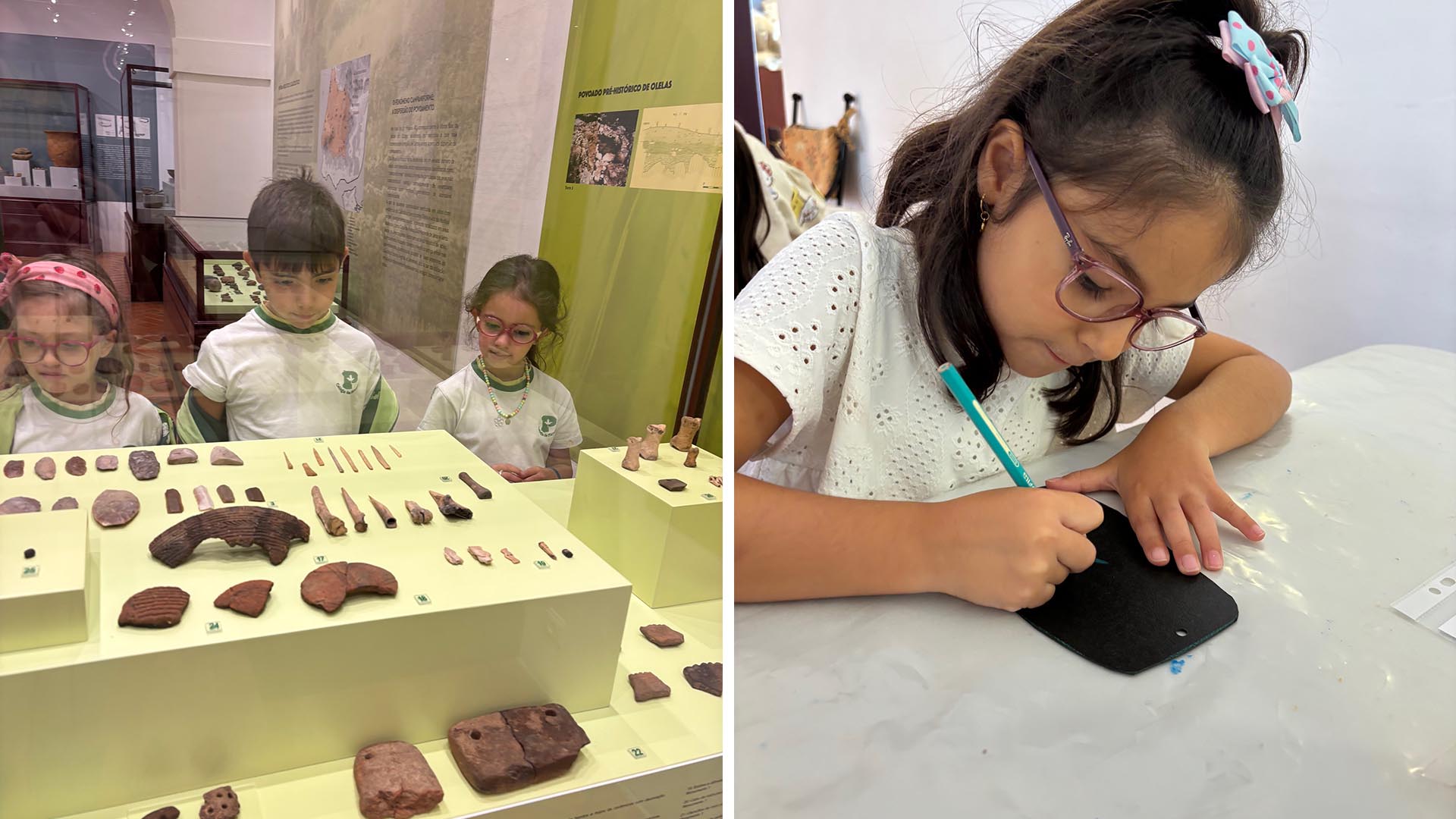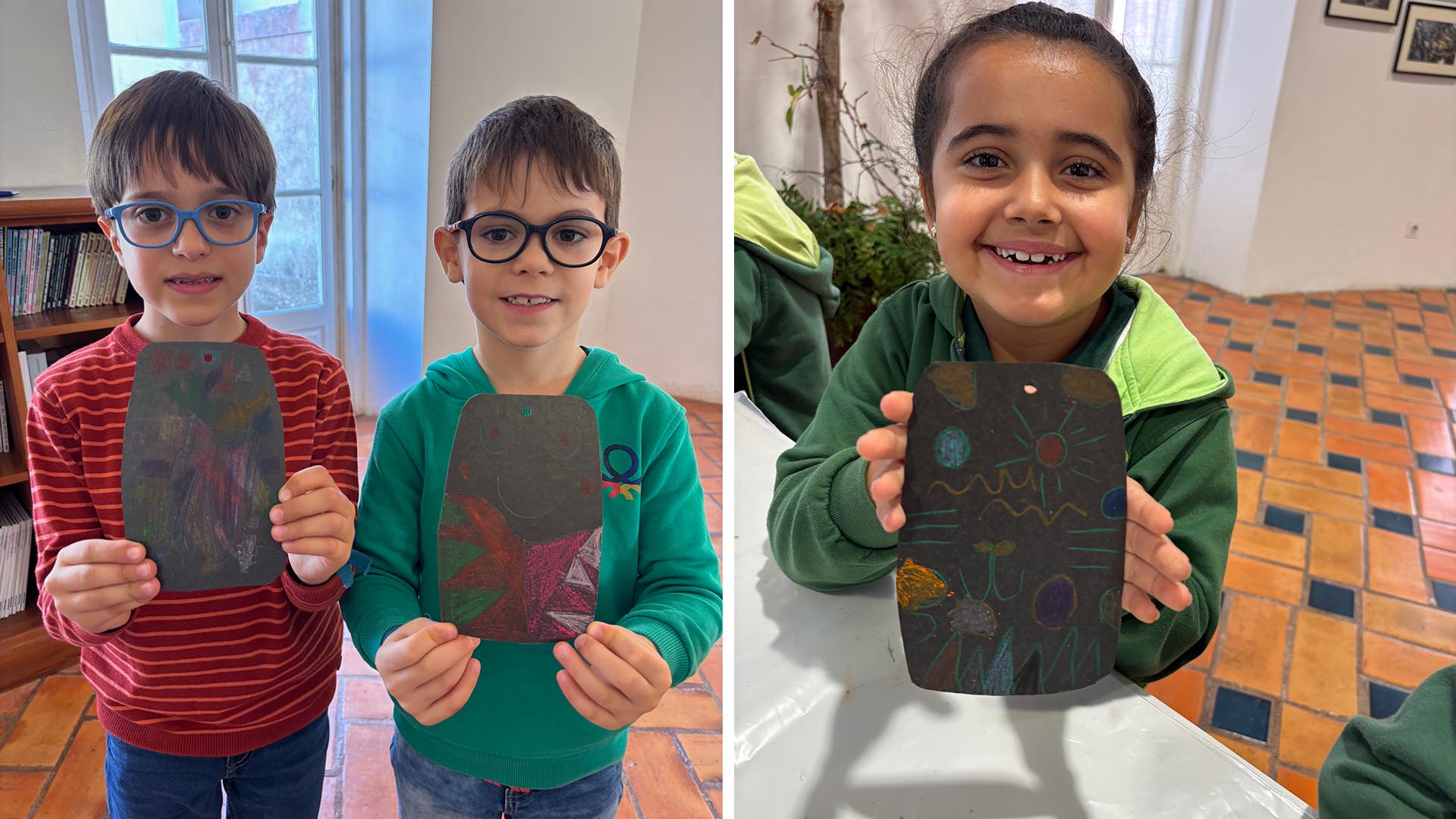 Depois, participaram numa atividade prática muito divertida: pintaram uma “placa preta”, recriando as que eram utilizadas pelos povos pré-históricos. A experiência permitiu-lhes explorar a sua criatividade e sentir-se verdadeiros artistas da antiguidade.