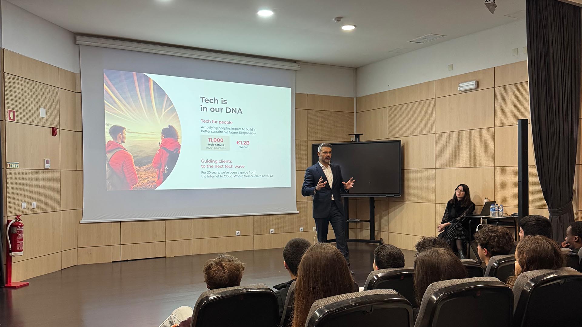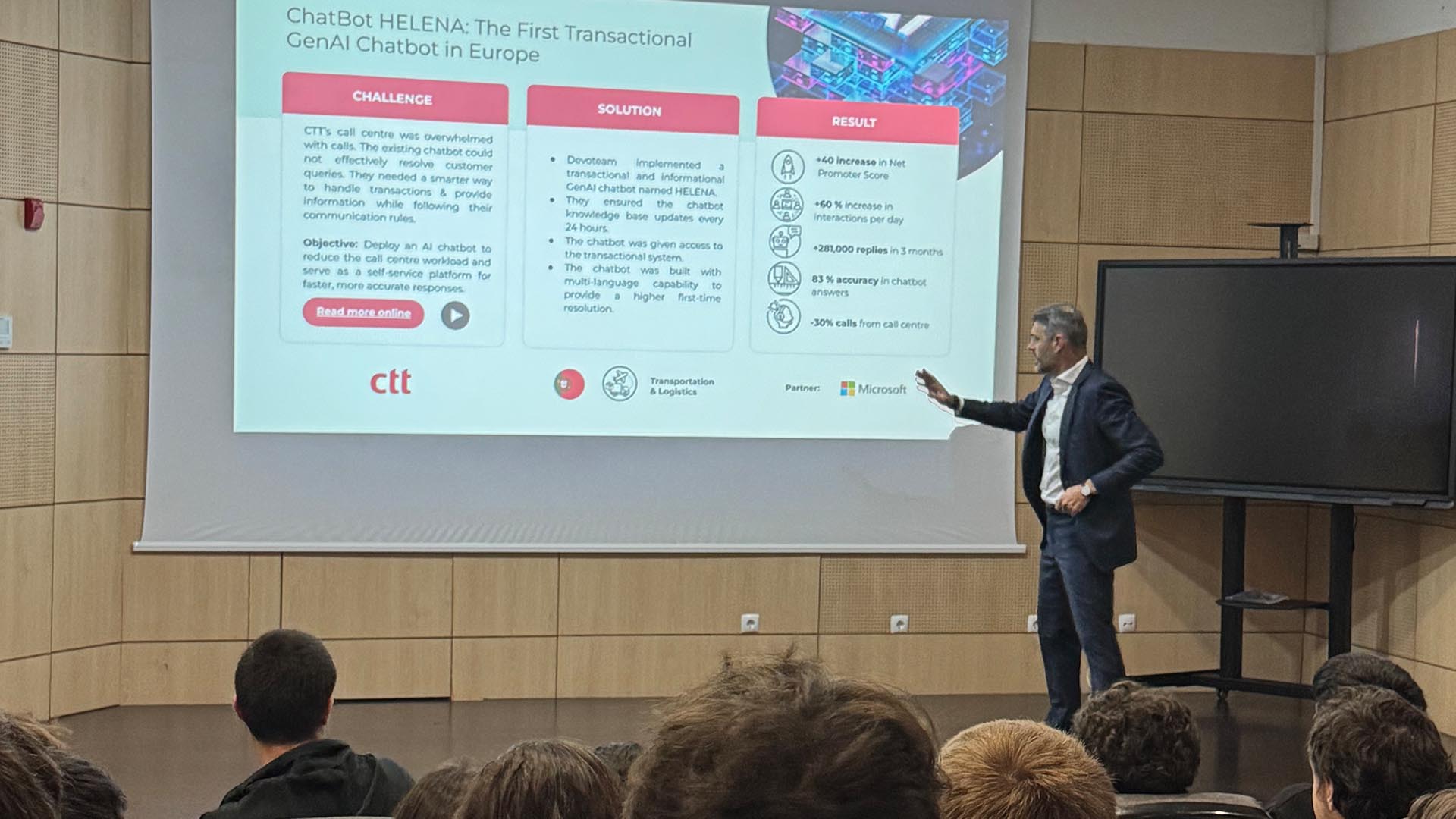 Durante a sessão falou-se de áreas como inteligência artificial, cibersegurança, desenvolvimento de software e transformação digital, e foram partilharam exemplos reais de projetos e desafios tecnológicos enfrentados no mundo corporativo.