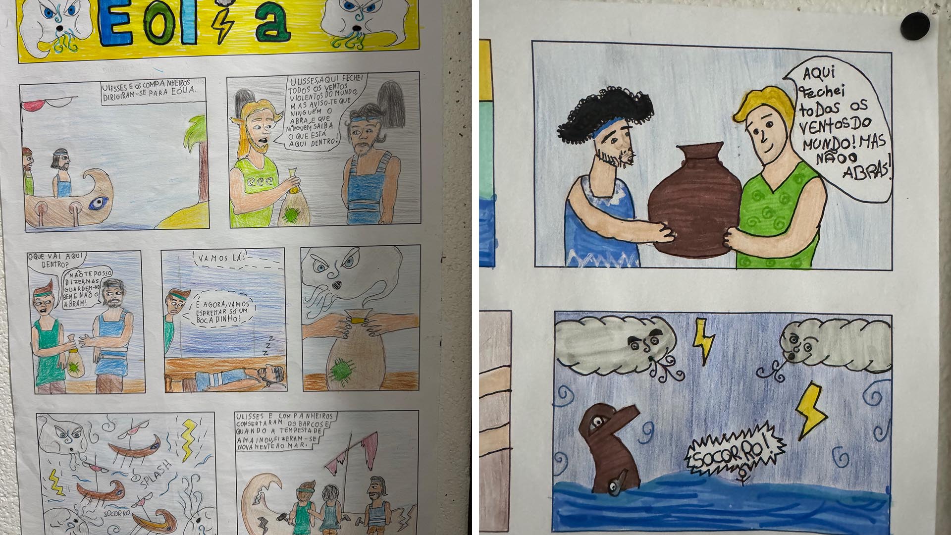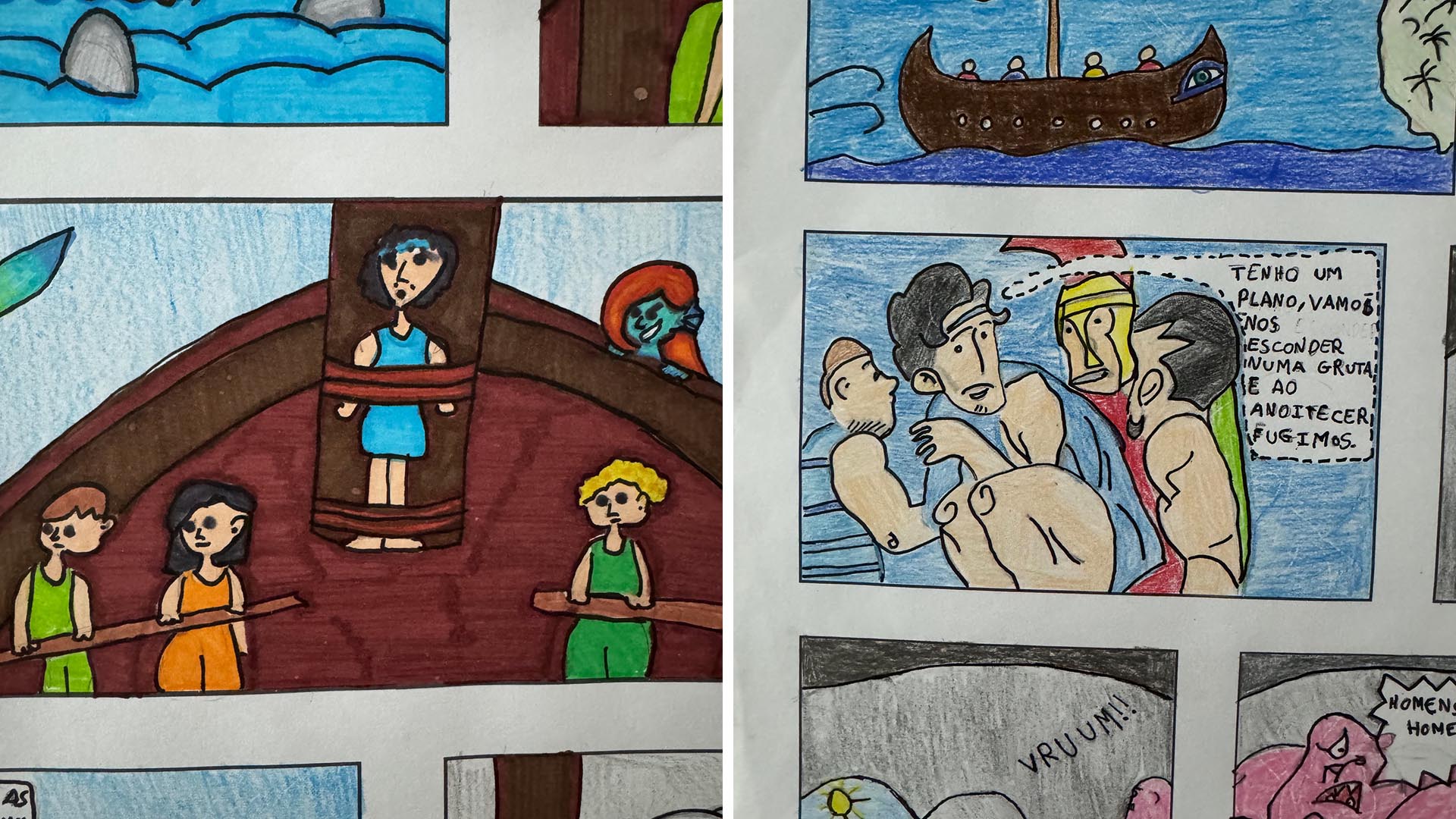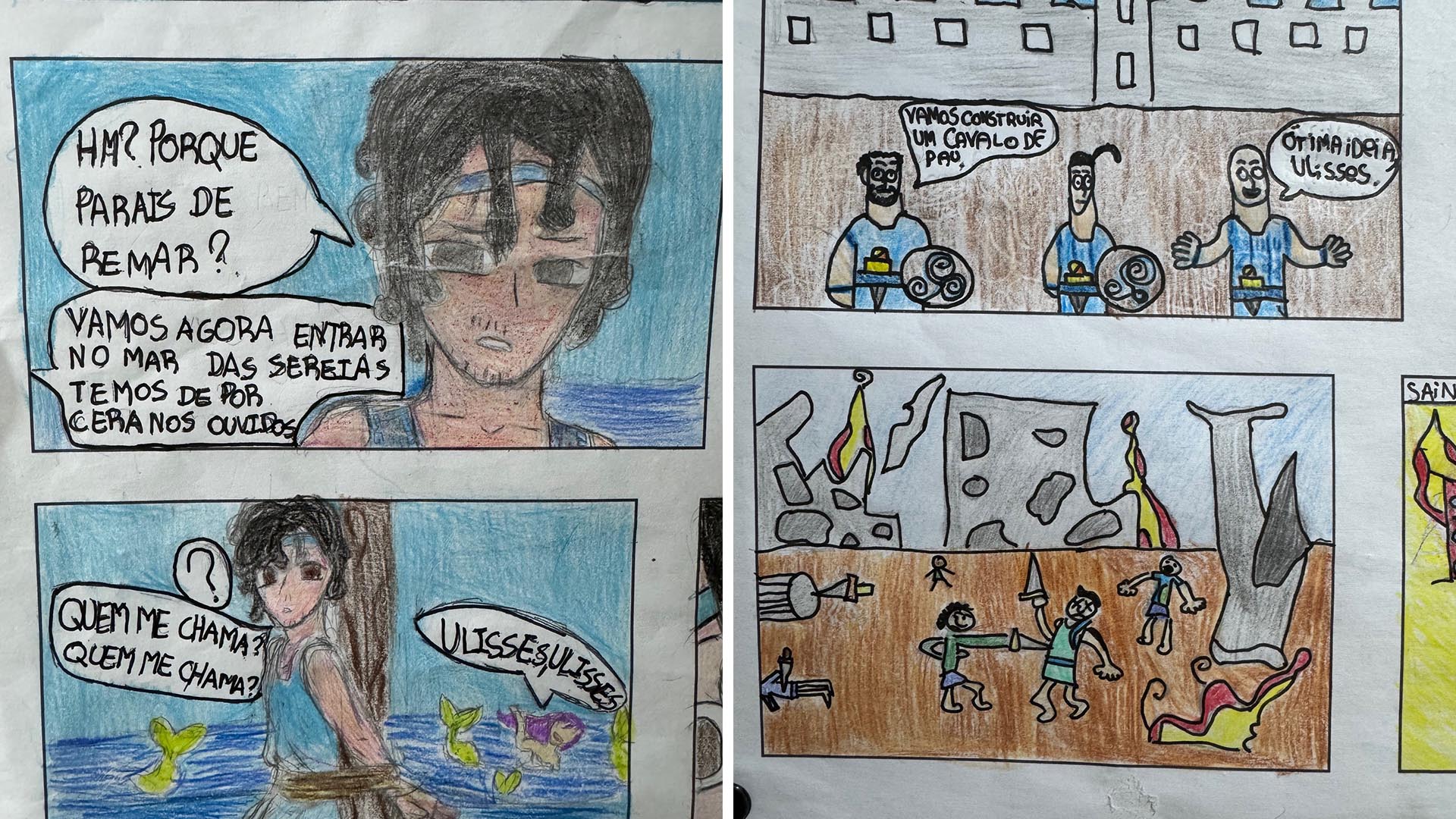 Para criar as suas ilustrações, os alunos escolheram vários episódios marcantes da história, como, por exemplo: “Troia”, “Ciclópia”, “Ilha de Circe”, “Ilha dos Infernos”, “Eólia”, “O mar das sereias” e o “Regresso a Ítaca”.